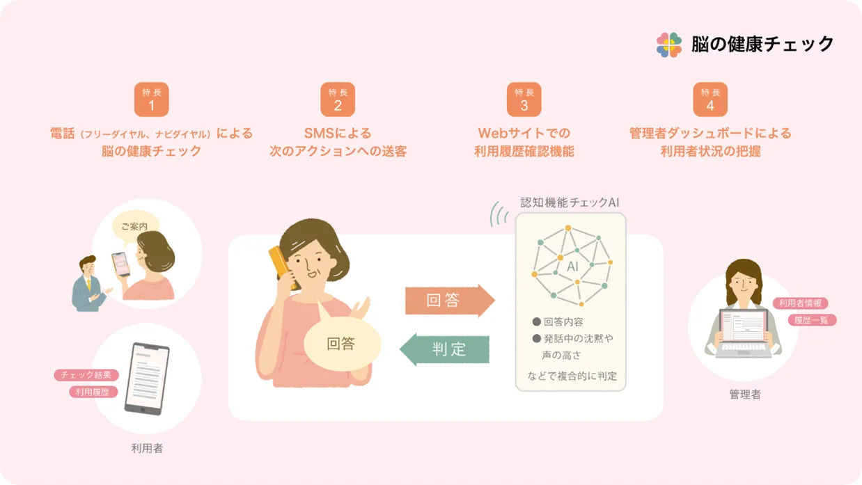 本サービスは利用者の脳の健康状態を電話で確認※2できるサービスです。自治体や保険業など、法人のお客さまにご契約いただくことで、その住民や加入者にご利用いただくことができます。