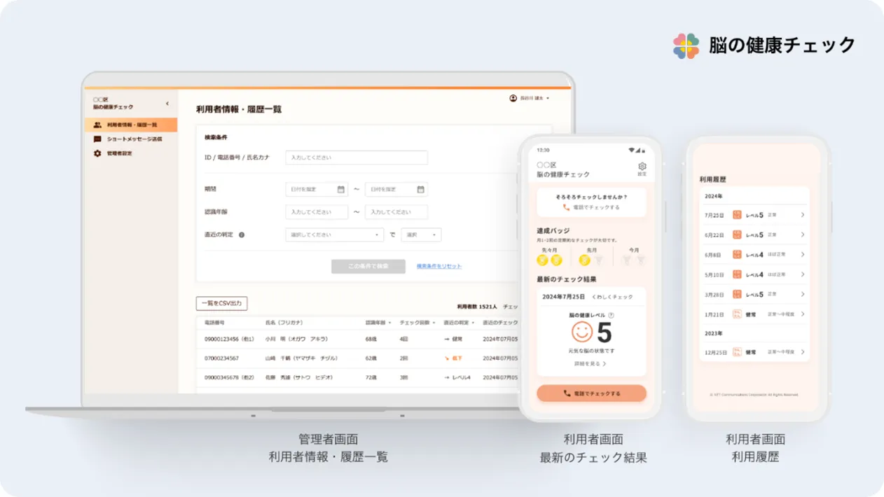 「脳の健康チェックフリーダイヤル」「脳の健康チェックplus」と同様のアルゴリズムを利用し、電話という高齢者が慣れ親しんだインターフェイスにより短時間で・どこでも・簡単に脳の健康チェックが実施できます。