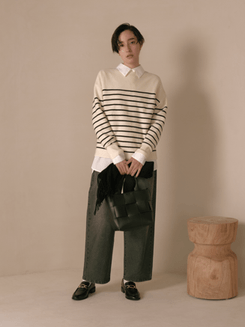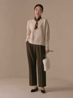 ガーター編みでシンプルなニットは、オフィスカジュアルからデイリーカジュアルまでお使いいただけます。テーパードパンツや落ち感のあるワイドパンツでスッキリきれいめに、デニム合わせでカジュアルに、スカート合わせも相性良く汎用性の高い一枚です。