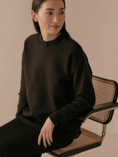 デコルテがきれいに見えるボートネックライン風な襟ぐりは、開きすぎないネックラインにこだわりました。袖口はややパフ感を出し、スッキリしたデザインの中にやわらかい雰囲気と女性らしさをプラスしています。裾はストレートにし、スカートにもパンツにも合わせやすいデザインにしました。