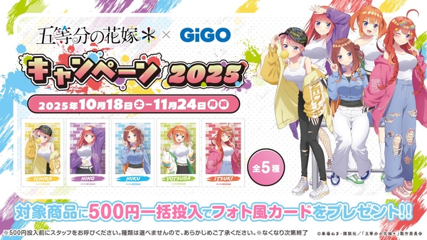 株式会社GENDA GiGO Entertainment(本社:東京都港区 代表取締役社長:二宮 一浩、以下「当社」)は GiGOグループのお店におきまして、TVスペシャルアニメ「五等分の花嫁*」とコラボした、“TVスペシャルアニメ「五等分の花嫁*」×GiGOキャンペーン”を2025年10月18日(土)から開催いたします。