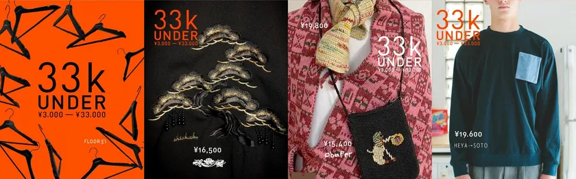 また、好評な特別企画「33k UNDER」(33k=33,000円)お求めやすいアイテムを取り揃えて、期間を延長して販売いたします。今回の“FLOOR 3.1 2024 AW EXHIBITION”でも特設コーナーを設け展示、即売します。在庫わずか、終了間近です。最後の機会を逃さず、ぜひご覧ください!