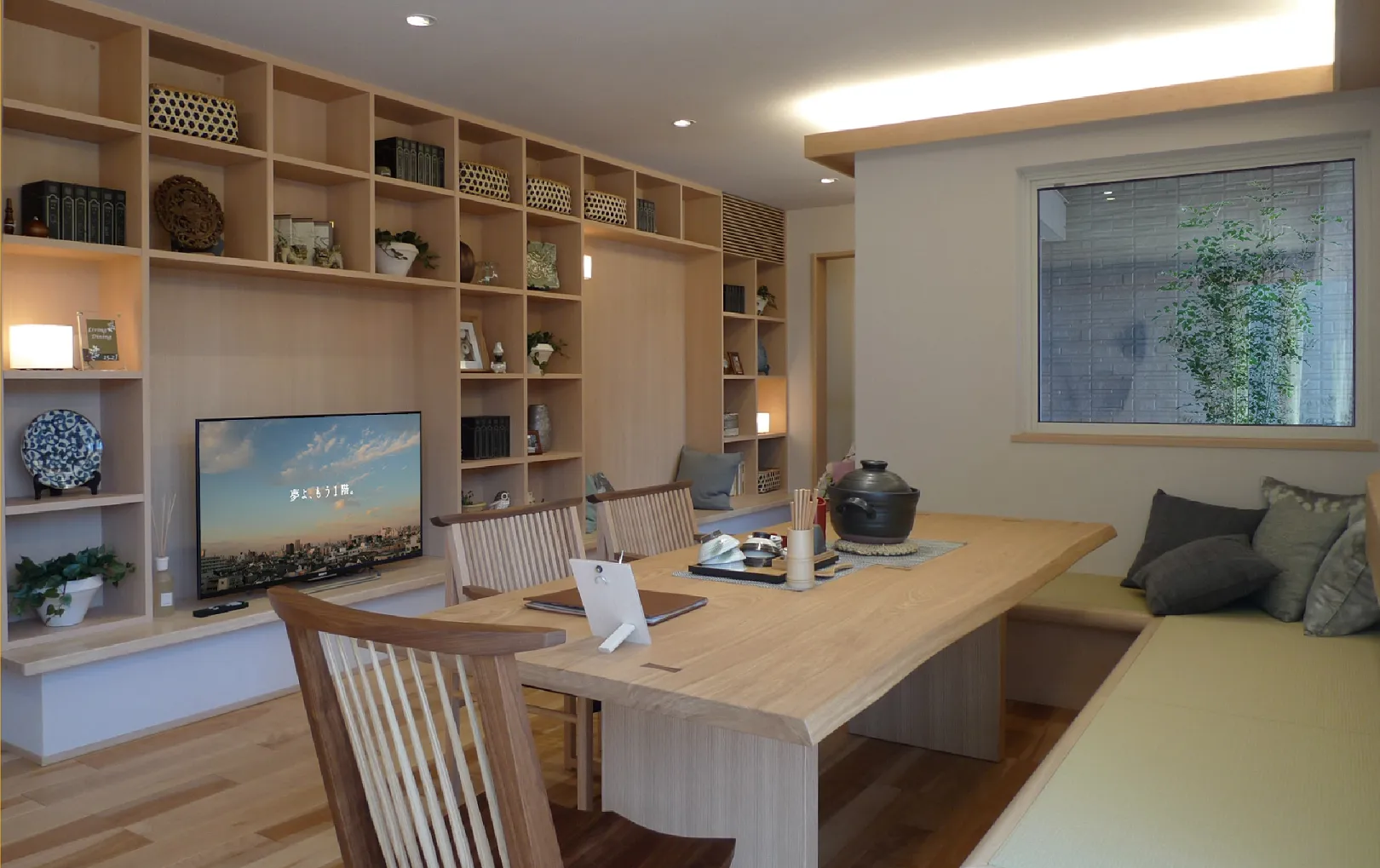 1. インテリアの基本は統一感:インテリアを整える基本は「統一感」を持たせること。最も簡単な方法は、空間を構成する、床材・壁材・天井材・ドア・造作収納といった建材と、家具、カーテン、ラグ、クッション、小物等のインテリアグッズの色味を揃えることです。フローリング等の床材の色を基調に、ドアや家具などの木部の色味を揃えることで、統一感が生まれます。カーテンやラグ等のファブリックは、床材の色に調和する穏やかな色調、もしくは、アクセントになる鮮やかな色を入れる方法もあります。ただ、多色過ぎると統一感を出すのが難しいため、最初は色数を絞ってみましょう。統一感が生まれたら、色使いにコントラストを付けたり、素材の異なるものを組み合わせたりしてチャレンジしてみるのもインテリアの楽しみ方の一つです。