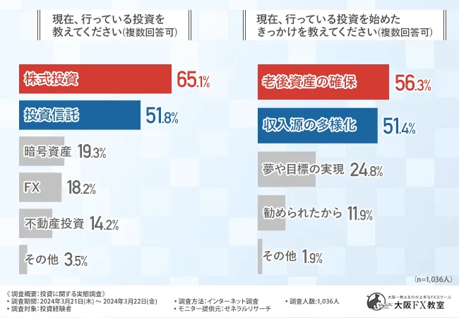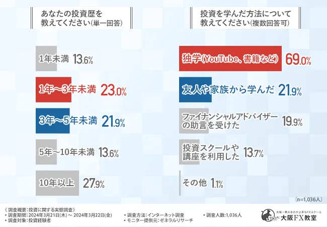 そこで今回、オンラインFXスクール『大阪FX教室』(https://fx.osakaschool.com/)は、投資経験者を対象に、「投資」に関する実態調査を実施しました。