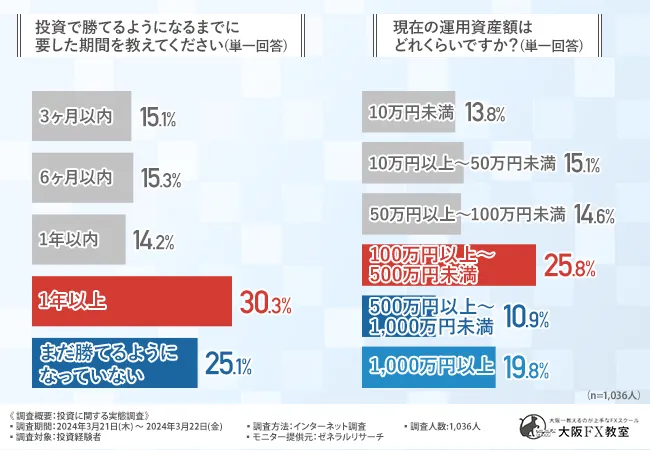 3割の人が投資で勝てるようになるまでに1年以上かかったという結果に!多くの投資経験者は『独学』で学んでいる一方で、間違った学習方法だったと思うことも…