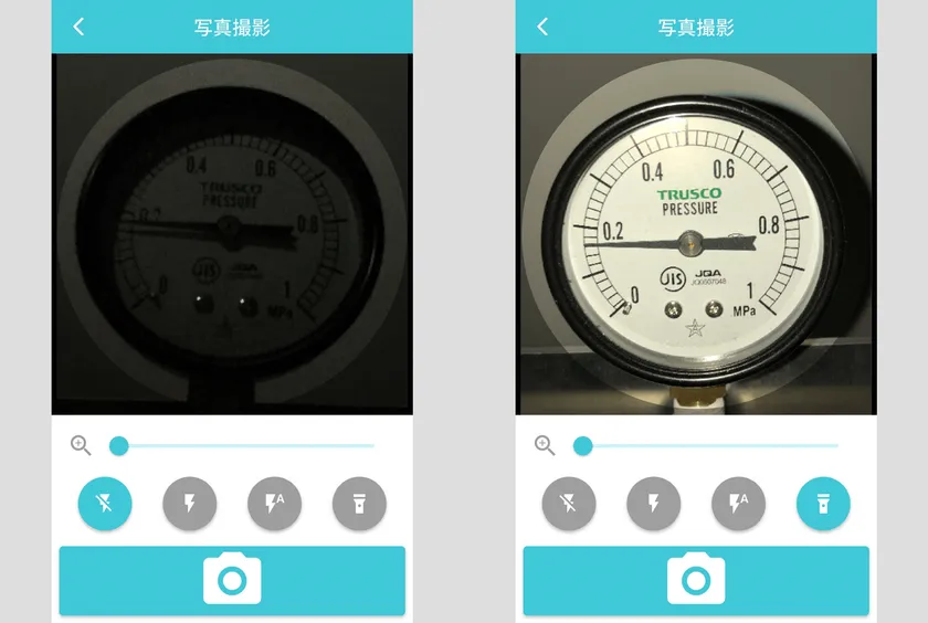 撮影時のフラッシュ点灯パターンを消灯/点灯/オート/常時点灯(※)から選択できるようになりました。従来は周囲の明るさに応じて自動で点灯する「オート」のみでしたが、点検担当者が照明や撮影対象の質感などにあわせて切り替え可能となり、より鮮明な記録を残せるようになりました。