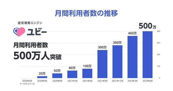 Ubie株式会社(本社:東京都中央区、共同代表取締役:阿部吉倫・久保恒太、以下「Ubie」)が提供する、症状検索エンジン「ユビー(https://ubie.app/)」の月間利用者数(UU)が2022年5月で500万人を突破しました。2020年4月のサービス提供開始から月間利用者数(UU)は約1年で100万人、約2年で500万人となり、累計利用回数は全国で3900万回にのぼりました。全国の幅広い年齢層に利用され、「気になる症状が出た際、関連病名と受診に必要な情報を調べられるサービス」という認知と活用が広まっています。