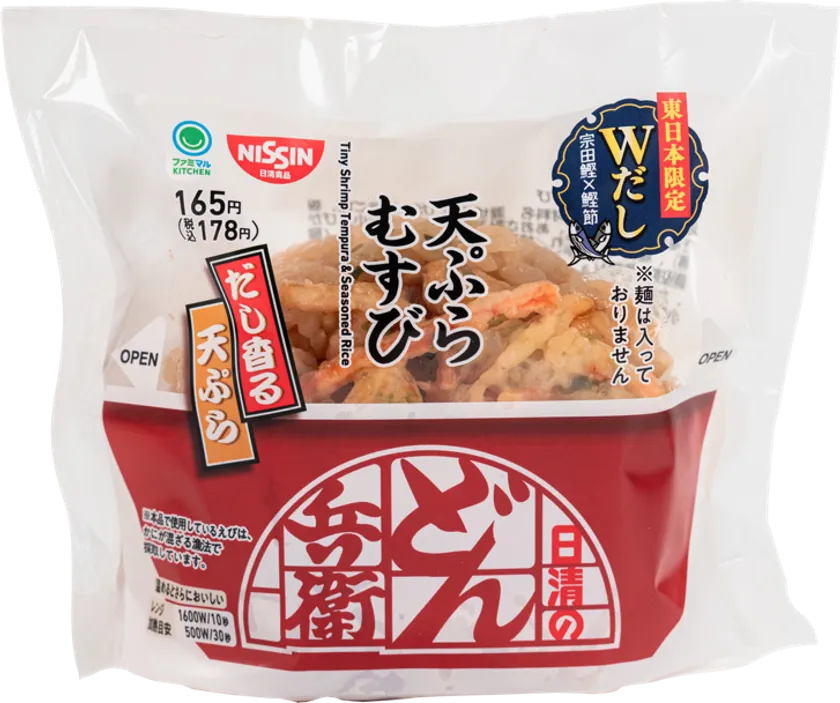 【内容】日清食品が展開する人気和風カップ麺「日清のどん兵衛」とのコラボレーション商品です。どん兵衛こだわりのだしが香るごはんに、玉ねぎの甘みと小エビの風味がポイントの天ぷらをトッピング。どん兵衛さながらの旨みを味わえます。地域ごとに味わいを変えており、東日本は宗田鰹と鰹節のWだしでコクと旨みを感じる仕立て。西日本は鰹と昆布のWだしで上品なだしの旨みが後引く味わいになっています。