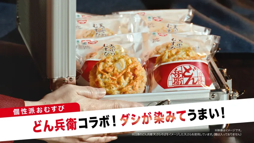 また、大人気和風カップ麺「日清のどん兵衛」の味わいをイメージしたおむすびは、今回は新たに「どん兵衛天ぷらむすび」が登場いたします。昨年よりさらにだしを効かせて、玉ねぎの甘味と小エビの風味がたまらないかき揚げ天ぷらを組合せました。