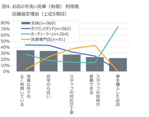 お店の手洗い洗車を利用する理由は「車全体をまとめてきれいにしてくれる」が55%と最多で、「いつもお願いしているお店/スタッフがいる」が30%と洗車技術を信頼し依頼している様子がうかがえる。利用店舗はガソリンスタンド(58%)に続き、カーディーラー(27%)、洗車専門店(9%)であった。その店舗に洗車を依頼した理由については、「洗車以外でもよく利用している(35%)」、「自宅から近い(34%)」が上位に挙げられた。(図4)。洗車専門店の利用者では「スタッフの技術が信頼できる」が最も高く43%であった。車に複数回コーティングを施工したことがある人では、主な洗車手段として「お店の手洗い洗車」を利用する人が17%に上り、車への愛着が高く、美観維持へのこだわりが強い様子が見受けられる。