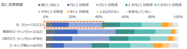 自動車保有者15,223人に対し洗車の頻度について調査したところ「月に1回程度」のペースで洗車をする人が最も多く25%を占め、月に1回以上洗車をする人は42%に上った(図1.オレンジ枠)。「3か月に1回程度」が16%、「半年に1回程度」が15%であった。車にコーティングをしている人は月に1回以上洗車をする割合が高く、購入時などに1度コーティングをした人では48%、複数回コーティングをした人では53%と愛車を綺麗に保ちたいという意識がうかがえる。洗車のきっかけでは「ボディの汚れが目立った」という回答が79%と圧倒的に多く、2番目の「前回から一定期間が経過」は19%、3番目の「フロントガラスの汚れが目立った」は16%に留まった。月に2回以上洗車をする人は「フロントガラスの汚れが目立った」が26%、「雨が降った後」が22%と車の汚れに対して敏感な様子が見られた。主な洗車手段については、自分で手洗いする人が49%、洗車機を利用する人が41%で両者を合わせて9割に至った。また、お店の手洗い洗車(有償)を利用する人は7%であった。