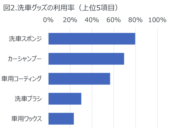 自分で手洗い洗車をする人の多くは自宅の駐車場や庭(86%)で行っており、洗車場を利用する人は9%であった。洗車時に使用する用品では洗車スポンジが80%、カーシャンプーが70%、車用コーティングが57%であった(図2)。カーシャンプーなどの用品を購入する際に参考にしている情報源は「インターネット上のレビューなど」が12%、「商品パッケージ」や「店頭の販促物」が10%、「YouTube動画」が8%であった。洗車頻度が多い人ほどインターネットのレビュー、YouTube動画を見る割合が高い傾向が見られ、よく使うアイテムだからこそ使用感を確認したいものと思われる。