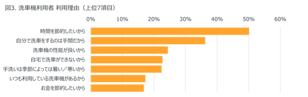 ・ 洗車機利用者は「時間の節約(50%)」と「手間の省略(36%)」を利用理由の上位に挙げた。