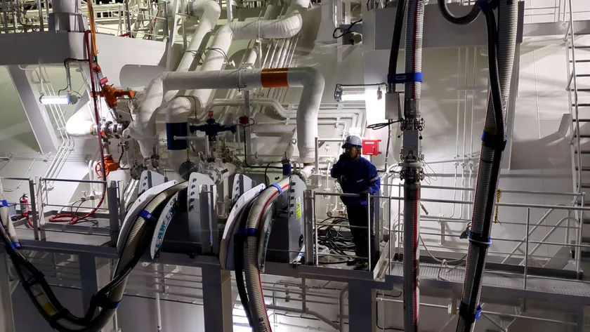 LNGバンカリング船と燃料供給を受ける船をホースで繋いで直接燃料を供給する方法