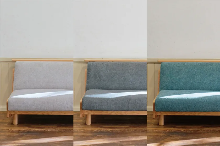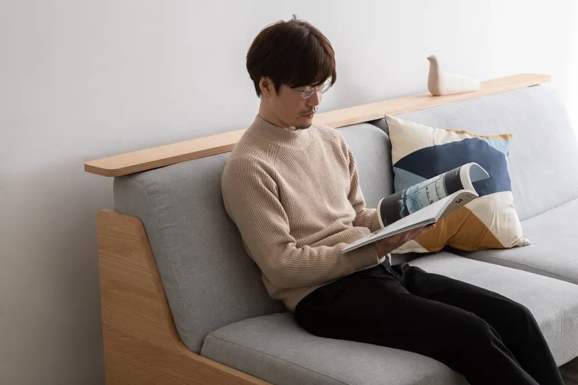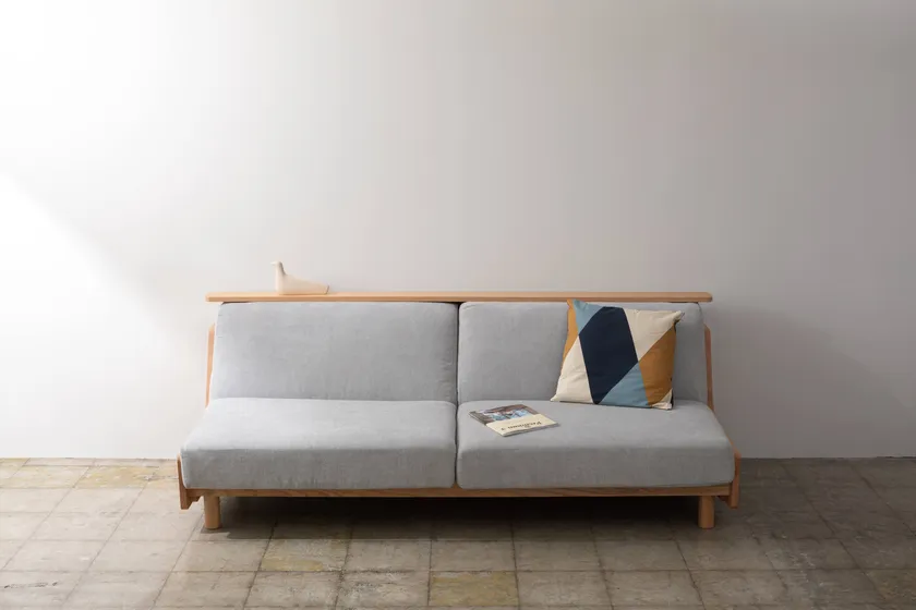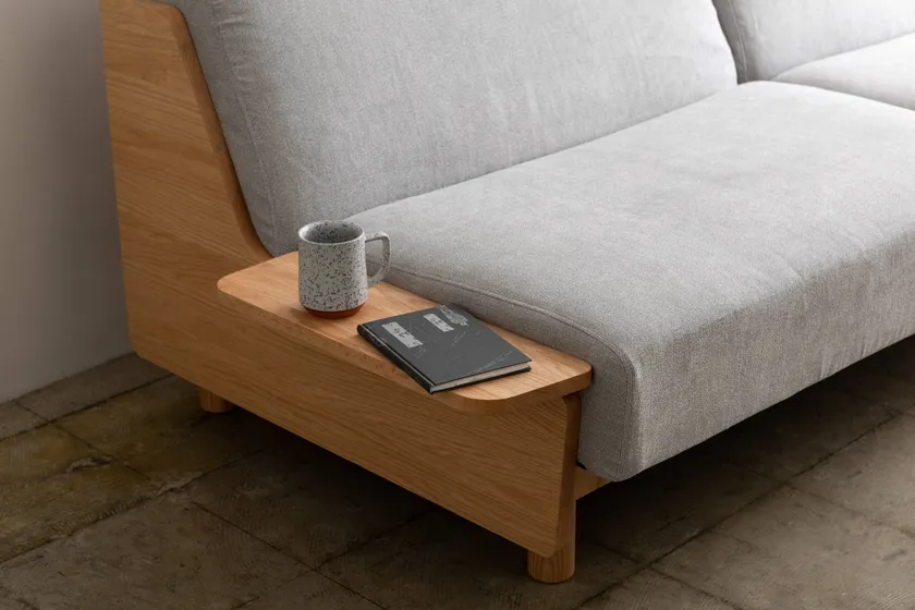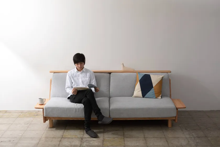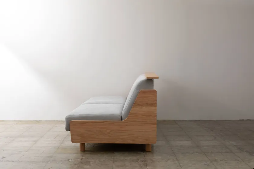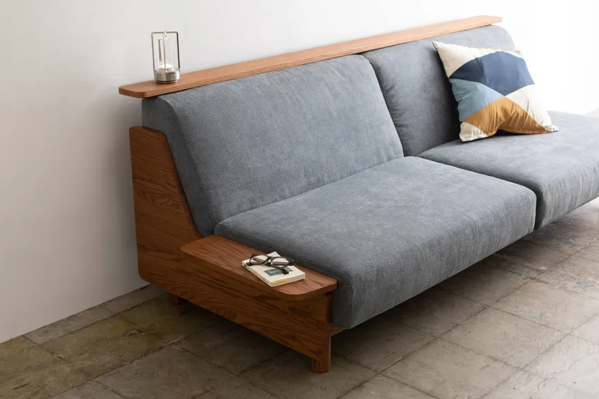ゆったりとくつろげる座り心地の良いソファに背もたれの上に小物を置ける長尺の棚を組み合わせました。生地は引っ掻き傷や汚れに強く、清潔にお使いいただけます。また、様々な使い方に合わせられるよう、本体側面に追加できるサイドテーブルや簡単に付け外しできるシートカバーをオプションとして備え、お部屋でリラックスした時間を過ごすための快適さを追求しました