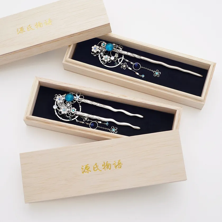 源氏物語シリーズの「簪-かんざし-」は、高級感のある金の箔押しで「源氏物語」と印字したオリジナルの木箱で皆様のお手元にお届けいたします。 白木に金の文字が映える美しい仕上がりで、箱を開ける時もまたお楽しみのひとつです。