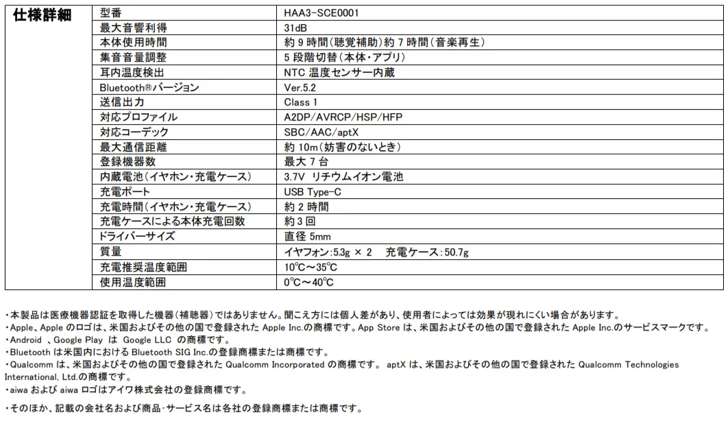 ※【aiwa hear SCE1】については製造元のイアフレド株式会社へお問い合わせください