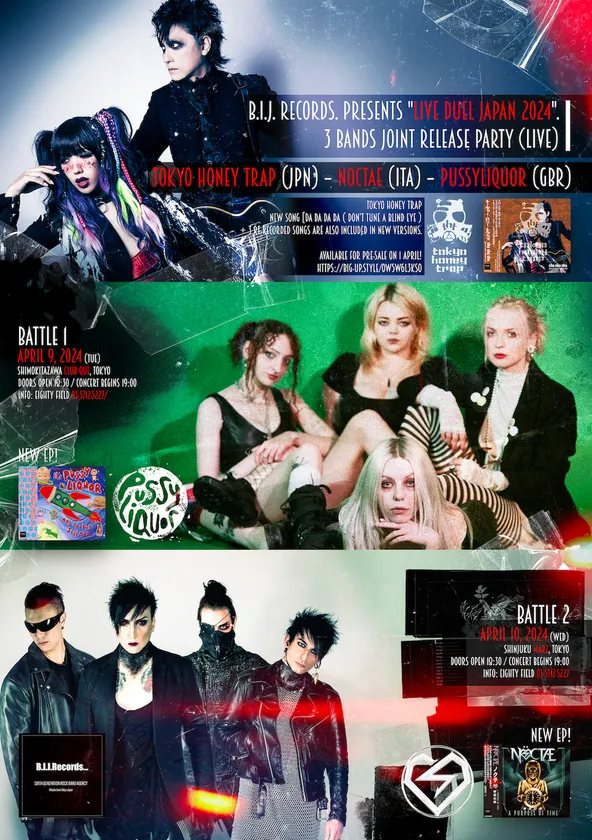【No Risk No Future】をスローガンに第六世代のロックを標榜するB.I.J.Records.が、「新人バンドやアーティスト達を独特の選択眼で世界中から集め、日本から世界的スターを育てる事」をコンセプトに、イタリアよりNOCTAE、イギリスよりPUSSYLIQUORを招き、日本からは首謀バンドであるtokyo honey trapが出演となる三国同盟 リリースパーティーライブイベントの開催が、いよいよ2024年4月9日(火)、10日(水)に迫っていることをお知らせします。