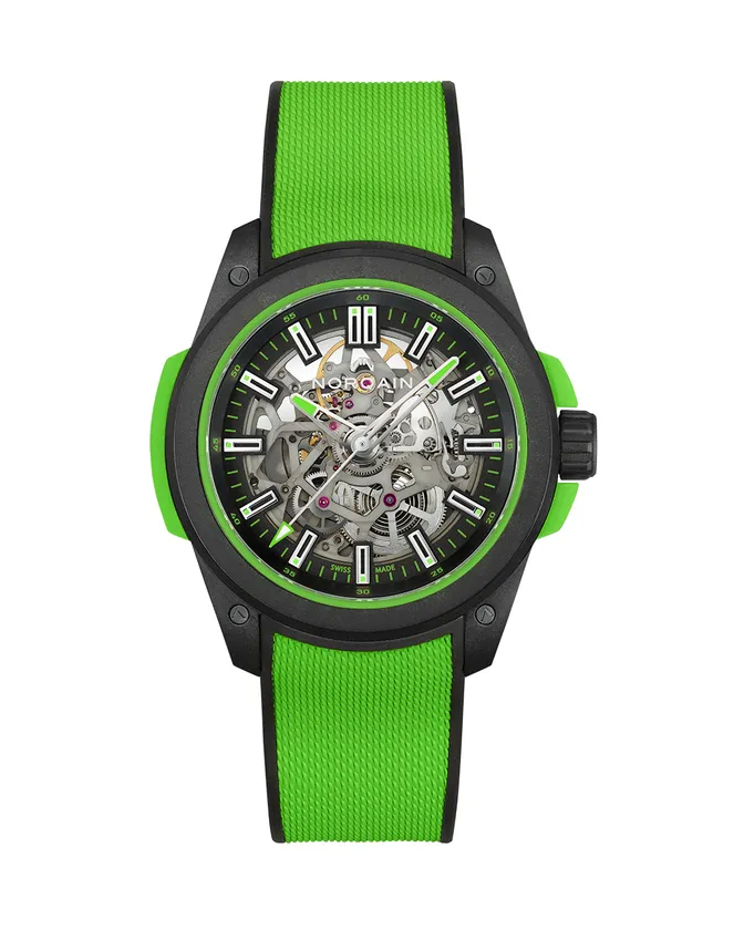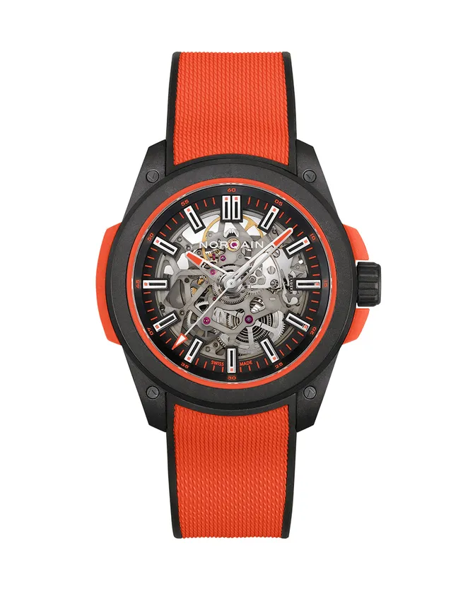 昨年夏の発表から話題を集めるベストセラー、ワイルドワン・スケルトン・ターコイズに、新たにWild ONE Skeleton CoralとWild ONE Skeleton Geckoが加わりました。両モデルとも、ノルケインの究極のスポーツウォッチ、ワイルド・ワン・スケルトン42mmをベースに開発。オープンワークの文字盤と5,000gの耐衝撃性を備えています。両モデルとも、革新的なケース構造を採用しており、超軽量で超堅牢な独自のカーボンファイバー複合材であるブラックNORTEQ(R)製の上下のケージの間にラバー製ショックアブソーバーを挟み込んでいます。