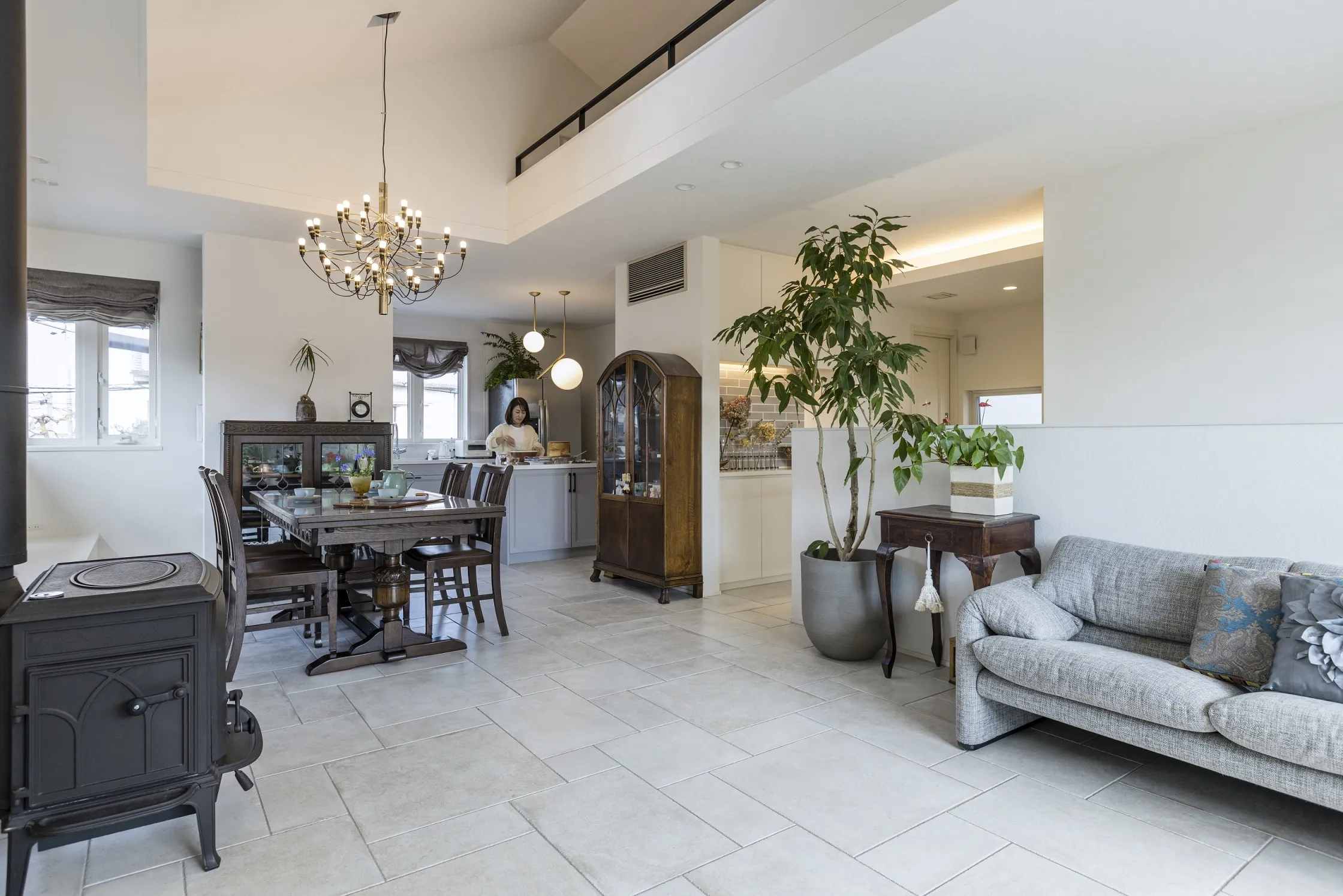 ダイニングテーブルやチェア、チェストなどのアンティーク家具と薪ストーブを美しく見せるために最もこだわったのは、それらを最大限に引き立てる空間の器づくりです。床、壁、天井の色は、ものの存在感を邪魔せず、上品で洗練された印象を与えるホワイトとグレーを採用しました。床材は、色むらのあるグレイッシュなタイルを大小のパターンを組み合わせて敷き詰め、変化に富んだ表情を生み出しています。