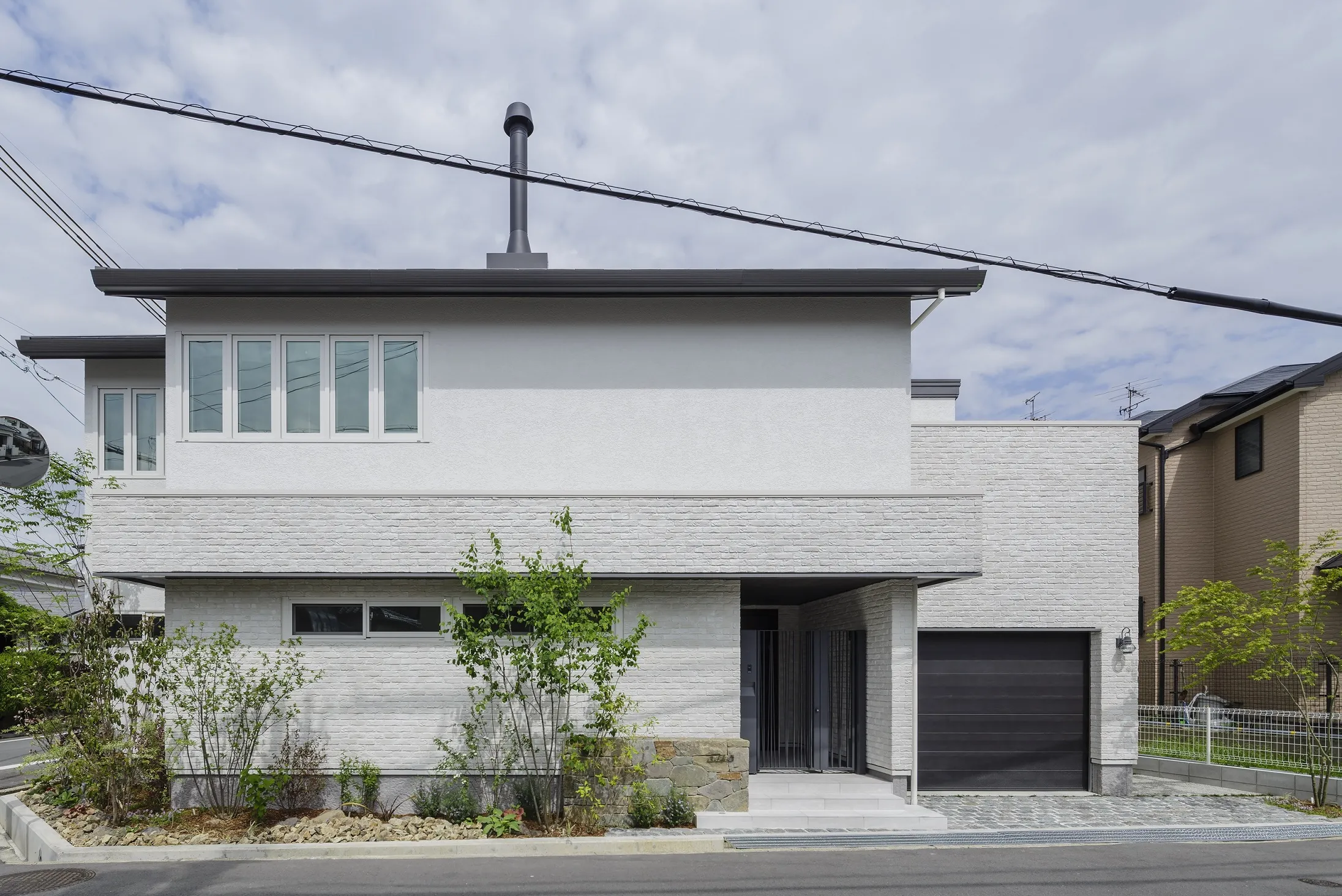 K様邸は、交通機関や道路のアクセスが便利でありながら、閑静な住宅地にある木造のお住まいです。外壁は吹き付けと手作り感のあるレンガタイル張りを組み合わせ、窓は縦型と横型をバランスよく配置し、洗練された印象を与えています。