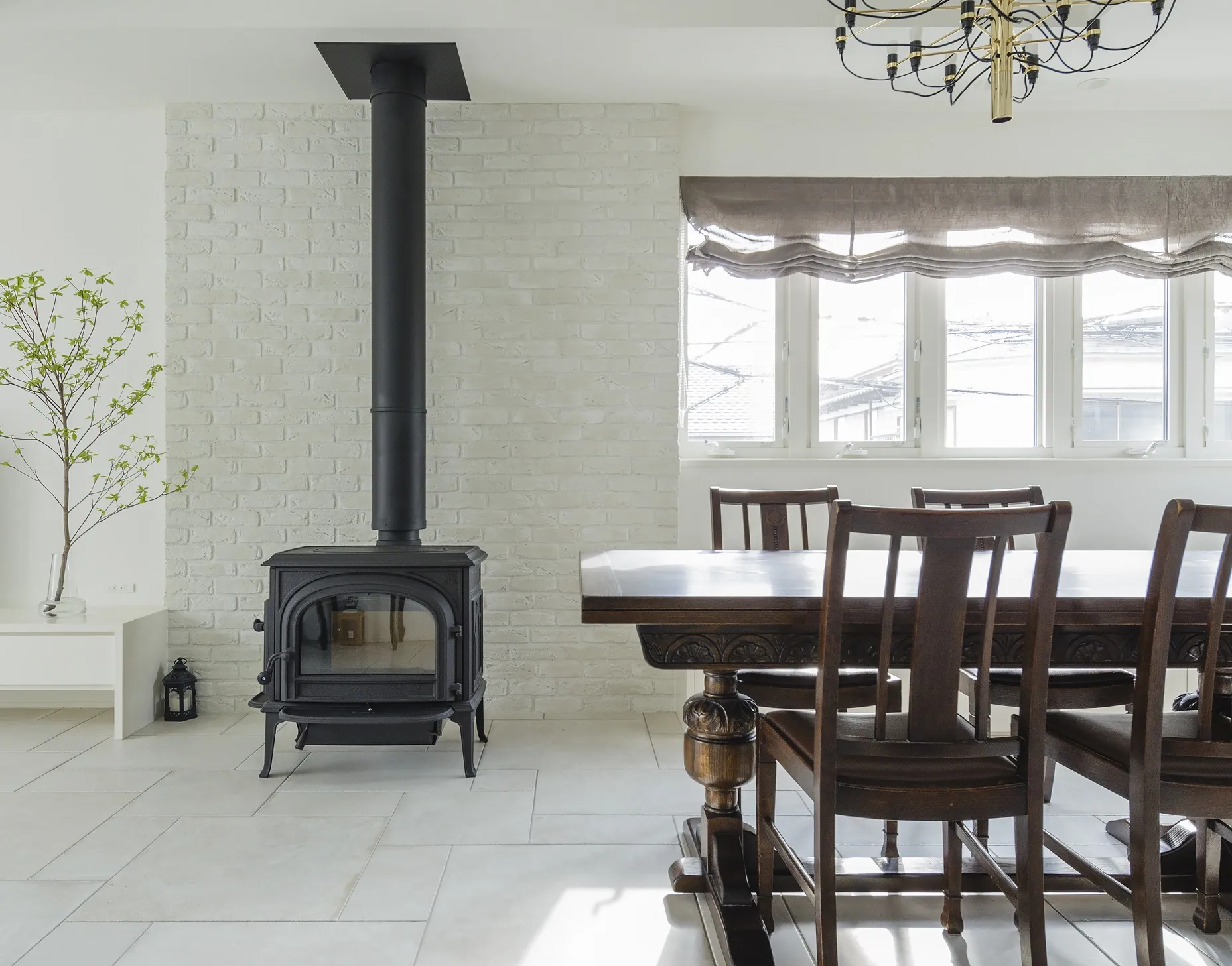 アンティーク家具と薪ストーブを引き立てる、上質なインテリア空間づくり