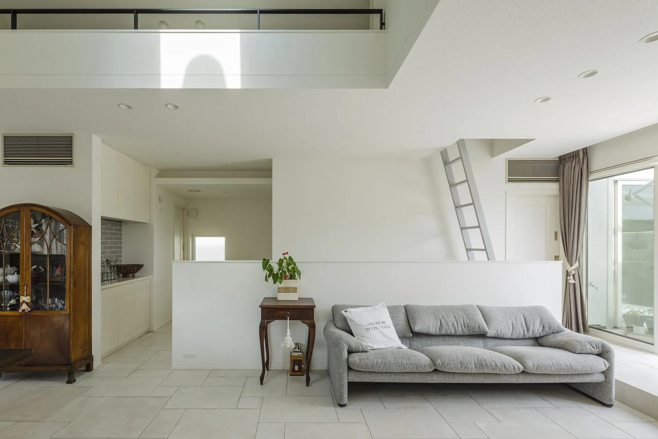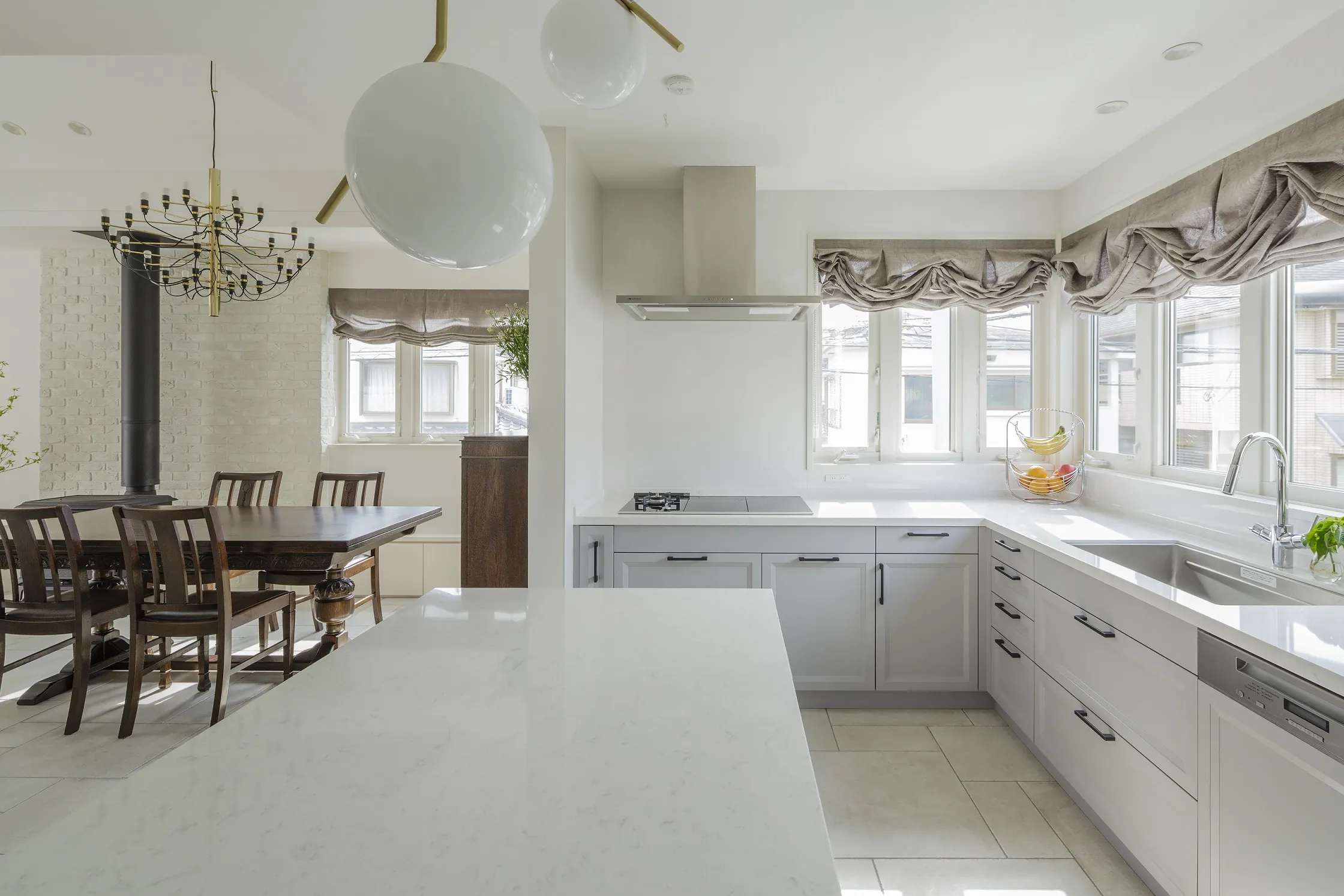キッチンは、北と西の角にL字型にレイアウトされています。中央には、大きなワークトップを設置し、作業や配膳がスムーズにできるよう工夫されています。窓枠はホワイト、キャビネットとワークトップの扉、そして床タイルはグレーを採用し、内装のベースカラーに沿ってまとめました。窓には、レースとドレープの中間のような生地を2枚重ねたツインシェードを取り入れました。ドレープのウエイトバーを外し、裾をバルーンのように丸くしたことで、キッチンに華やかさと上質感をプラスしました。