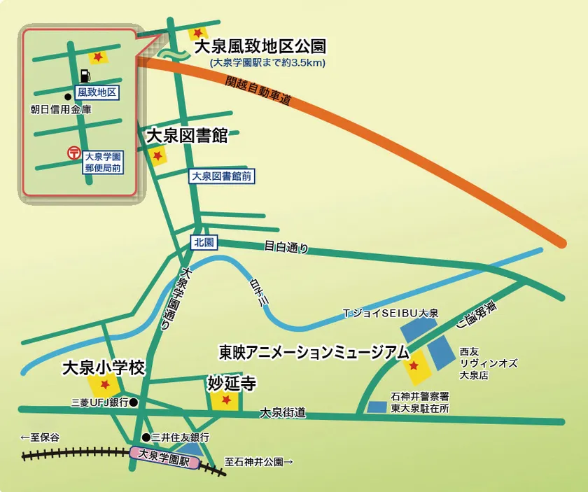 大泉アニメゲート、大泉小学校、妙延寺、大泉風致地区公園、大泉図書館、東映アニメーションミュージアム