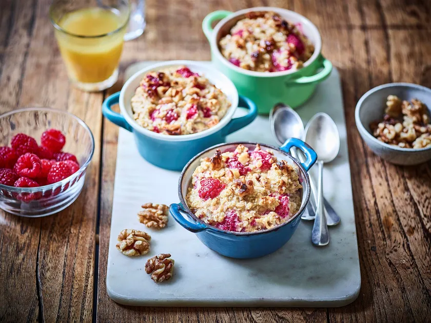 くるみ、ラズベリー、はちみつのベイクドオートミール