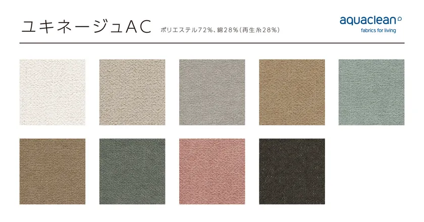 雪のようなふわふわタッチで、やわらかなカラー展開の生地。再生糸を使用しており環境にも配慮しています。水だけで汚れが落ちるアクアクリーン(R)テクノロジー加工。