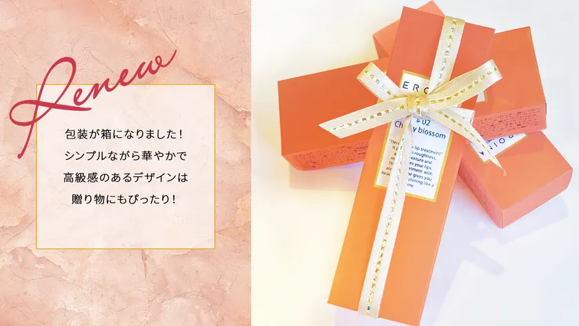 EROINA LIP TREATMENT#02は、今まで袋タイプだったパッケージと違ってBOXタイプにリニューアル。プレゼントでご利用のお客様も大変多かった事からギフト利用に、よりご満足いただけるようになります。