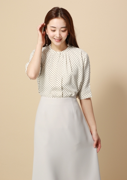 |フロントから流れるようなタック使いがアクセントのスタンドカラーブラウス