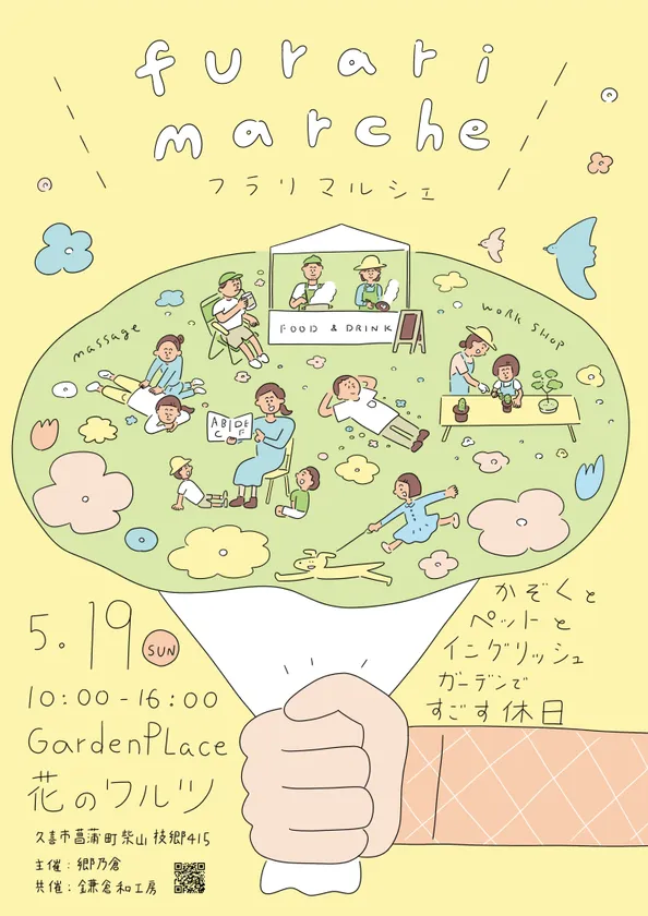 郷乃倉(埼玉県久喜市菖蒲町569-1、代表:平澤 栄樹)は5月19日(日)に久喜市菖蒲町周辺地域の飲食店とワークショップが集まるイベント『フラリ マルシェ』を開催します。出店者は決定次第お知らせします。