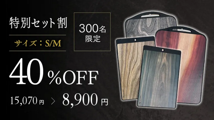 今回は特に沢山の方にTPU両面デザインまな板を知っていただきたいので、Sサイズは、超早割 45%off 3,990円で、そしてSサイズとMサイズを気軽に両方ご使用いただけるように、お得な【特別セット割】をご用意しました。