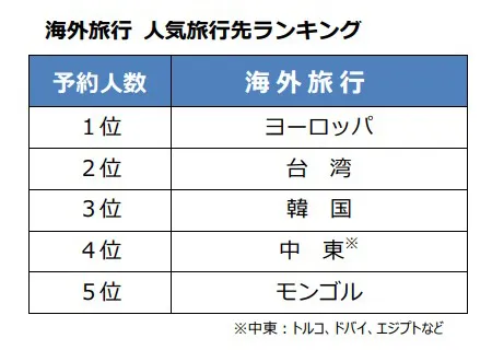 海外旅行の人気旅行先ランキングは、1位 ヨーロッパ、2位 台湾、3位 韓国となりました。