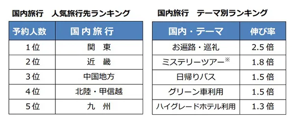 国内旅行の人気旅行先ランキングは、1位 関東、2位 近畿、3位 中国地方となりました。日帰りバスツアーは前年比1.5倍となり、シニア層に加えてファミリー層の需要の活性化が特徴です。また、グレードの高いホテルやグリーン車を利用した商品の需要も増加傾向にあります。