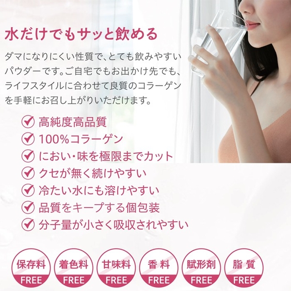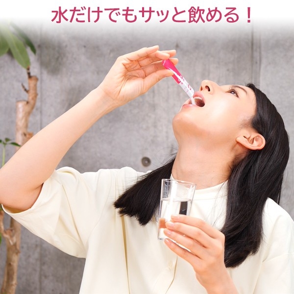 コラーゲンのにおい・味を極限までカットし、1包1,500mgの少量の個包装、そして独自のさらさら製法により、水だけでもサッと飲めるように仕上げました。