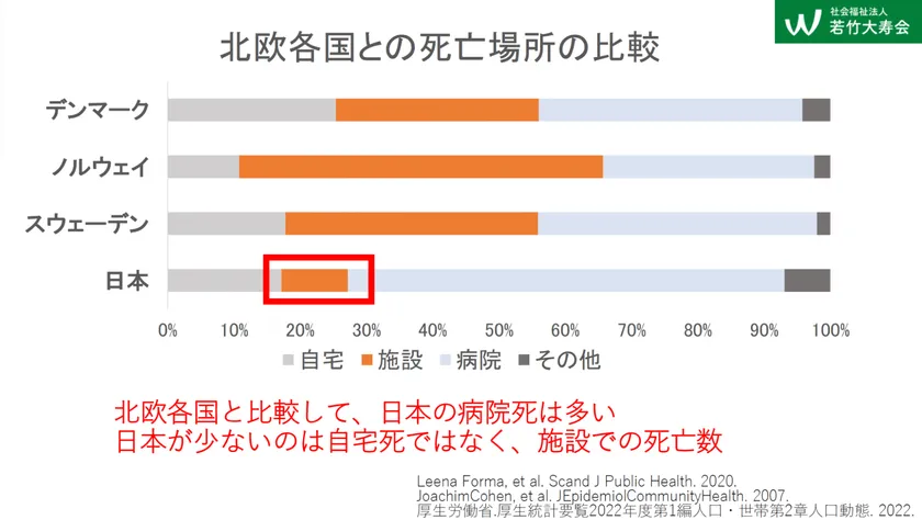 しかし、逆に浮き彫りになるのが「施設死の少なさ(看取り)」です。病院での看取りが多い現状は、これから迎える多死社会において今も増えている社会保障費ともリンクする課題です。