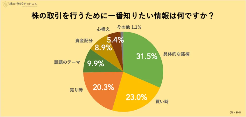 株の取引を行うにあたって、個人投資家が最も知りたいと思っている情報はどんなことか。調査の結果、最も多くの回答数を得たのは「具体的な銘柄」でした。800人のうち3割を超える252人(31.5%)がこの項目を選び、やはり、「どの株を買えばいいのか」という情報が求められていることがわかります。