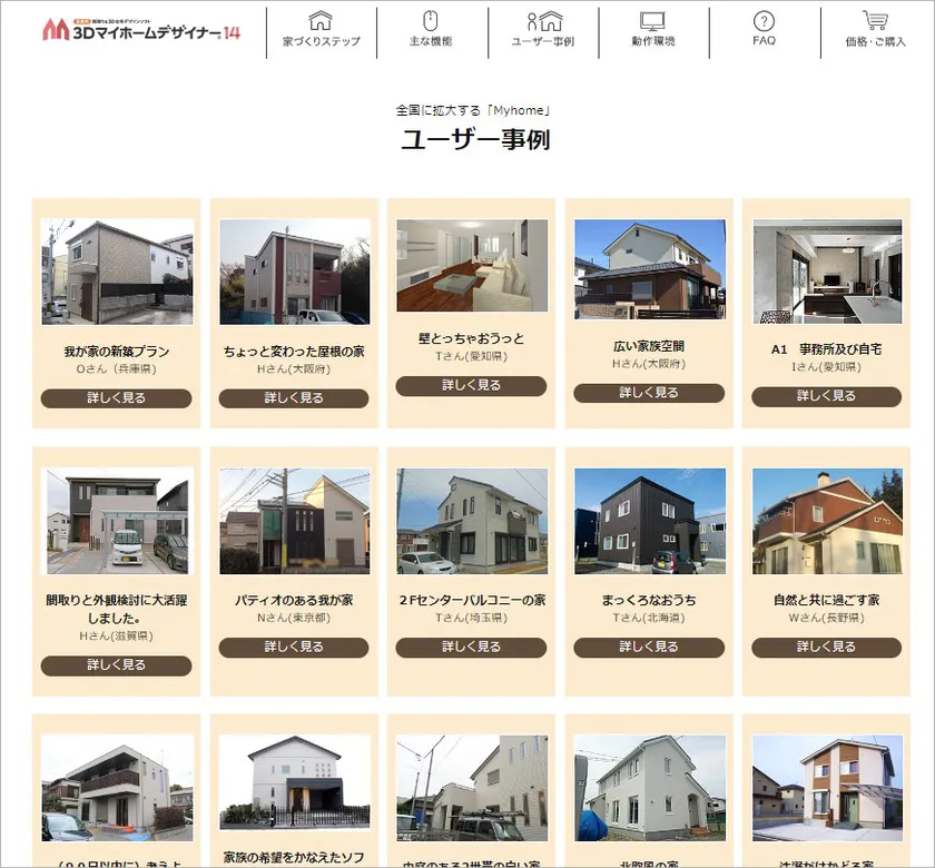 製品情報ページでは、3Dマイホームデザイナーで家を建てた事例を100軒、ユーザーのコメントとともに公開しています。