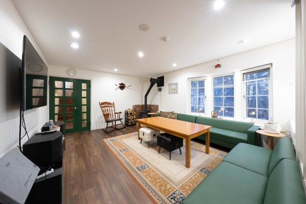 リビングは大人数でもゆったりと使え、冬季には薪ストーブが利用可能。