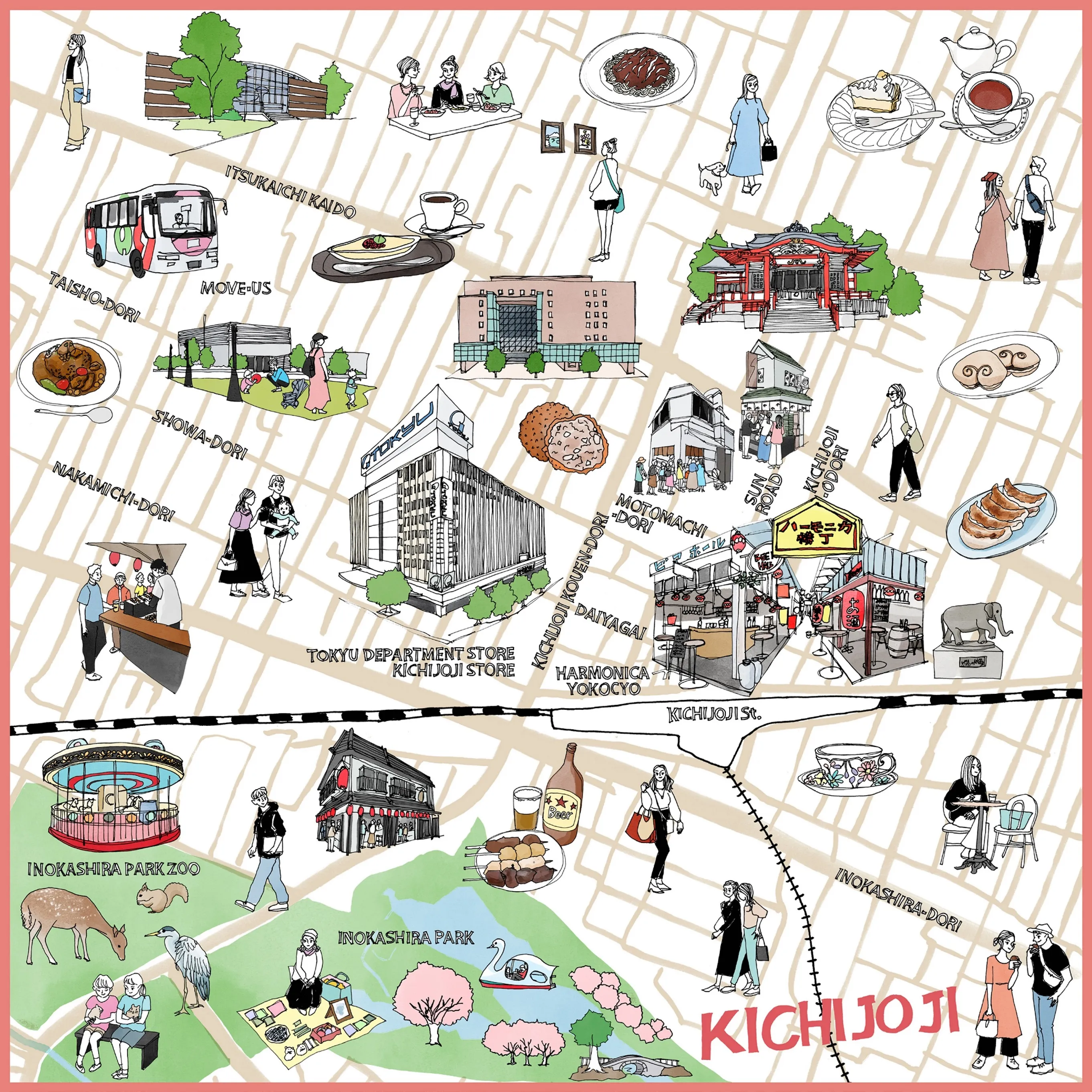 吉祥寺の街の人気スポットをマップハンカチに仕立てました。
