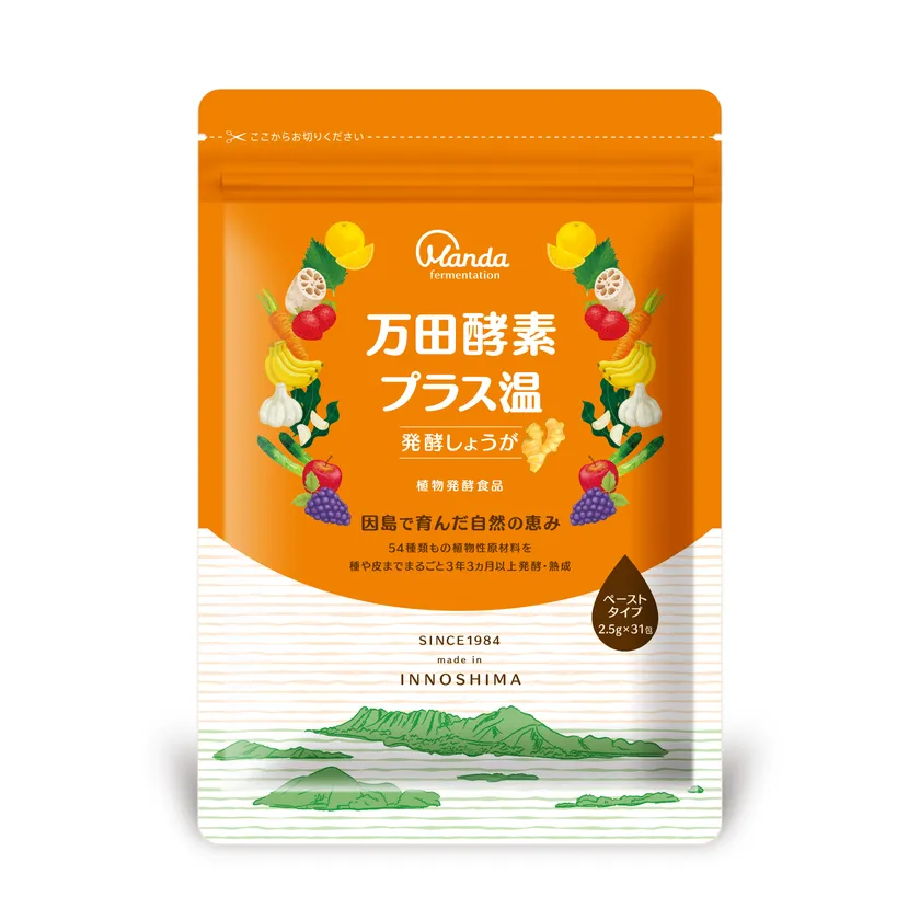 万田酵素は、選びぬかれた53種類以上の「果穀藻菜」(果実類、穀類、海藻類、野菜類)を使用し、独自の発酵技術を用いて3年3ヵ月以上発酵・熟成させた植物発酵食品。2023年12月に発売された本製品は、ショウガの配合量を従来品「万田酵素 GINGER」よりも50%増量、新製法「じっくりカラダに届ける製法」や、紙を主成分とした素材のエコパッケージを初めて採用するなど、パワーアップした商品です。