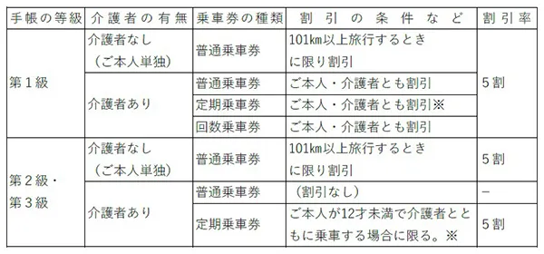 ・介護者とともに利用する場合は、購入する乗車券の種類・乗車区間・有効期間が同一で、同時にお買求めいただくほか、同一の列車に乗車する場合に限り有効です。
