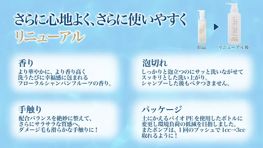 今回のリニューアルでは、これまでに寄せられた購買者の声を踏まえ「香り」「手触り」「泡切れ」「パッケージ」を改良。より心地よく、より使いやすいシャンプーを目指し製品化を実現しました。