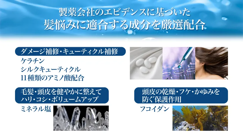 テルース製薬株式会社が独自開発した「ナノユニットクラスター」テクノロジーによる炭酸ガスを内包した水を使用。ナノユニットクラスターとは、水の分子をナノ単位まで小さくする技術のことです。水の分子がナノ単位まで小さいため、頭皮や髪の隅々まで成分が行き渡ります。また保湿補修効果によって毛髪の水分量保持や保湿力も向上しドライヤーですぐ乾くのに、内部はしっかりうるおう性質を持ちます。