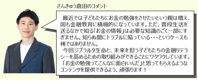 成年年齢の引き下げなど社会環境が大きく変化するなか、子どもたちが金銭面において自立した生活を営むための金融リテラシーを身に付けられるよう、吉本興業の所属タレントとジブラルタ生命が協同して、中学生をおもな対象とした金融教育コンテンツを開発します。