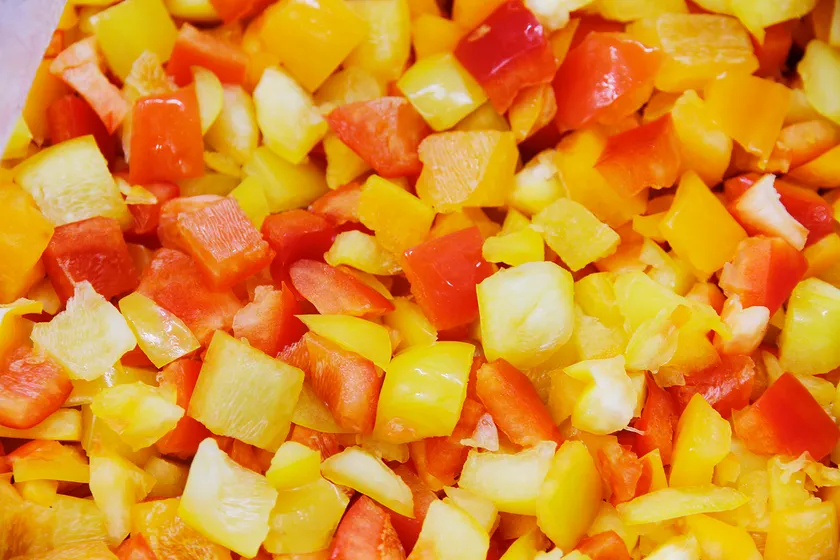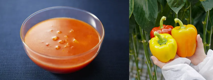 味わいの異なる「赤」、「黄」、「オレンジ」の3種類のパプリカを、自社工場でピューレーに加工し使用しています。オレンジ色のパプリカは甘みが強く、黄色のパプリカはさっぱりとした味わいで、赤のパプリカはその2つの中間の味わいです。パプリカを組み合わせて、ガスパチョにした時にバランスがよい味わいになるようにしています。