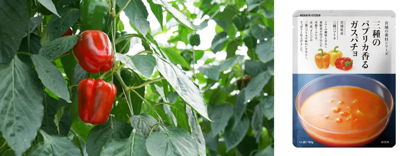 NISHIKIYA KITCHEN(ニシキヤキッチン)(株式会社にしき食品 本社:宮城県岩沼市、代表取締役:菊池 洋)は、2024年5月30日(木)より、宮城県産パプリカを使用した「三種のパプリカ香るガスパチョ」を数量限定で発売いたします。宮城県産パプリカは生産量日本一(※)を誇り、産地ならではのフレッシュさが魅力です。「三種のパプリカ香るガスパチョ」には味わいの異なる3種類のパプリカを使用し、トマトやきゅうりなどの夏野菜を合わせ、さっぱりとした冷製スープに仕上げました。素材本来のおいしさや香りを生かした味わいと、鮮やかな色合いが食欲をそそり、夏の食欲がない日にもおすすめです。ニシキヤキッチンでは、宮城県産の旬のこだわり素材を生かした「宮城の素材シリーズ」を展開しており「三種のパプリカ香るガスパチョ」を含め、これまでに8商品を販売しています。※農林水産省・令和2年産地域特産野菜生産状況調査による