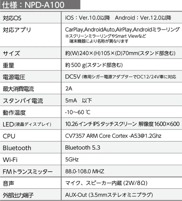 iOS(Ver.10.0以降)、Android(Ver.12.0以降)の端末機器と、ホーム画面でメニューを選択していくことで簡単にワイヤレス接続を行なえます。取付は付属している両面テープタイプの専用のスタンドをダッシュボードに設置し、シガー電源アダプターを車のシガーソケットに接続するだけで簡単に取付が可能です。視認性に優れた10.26インチのIPS液晶を搭載し、タッチスクリーンでスムーズな操作がおこなえます。